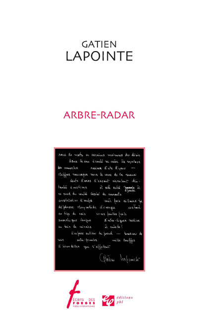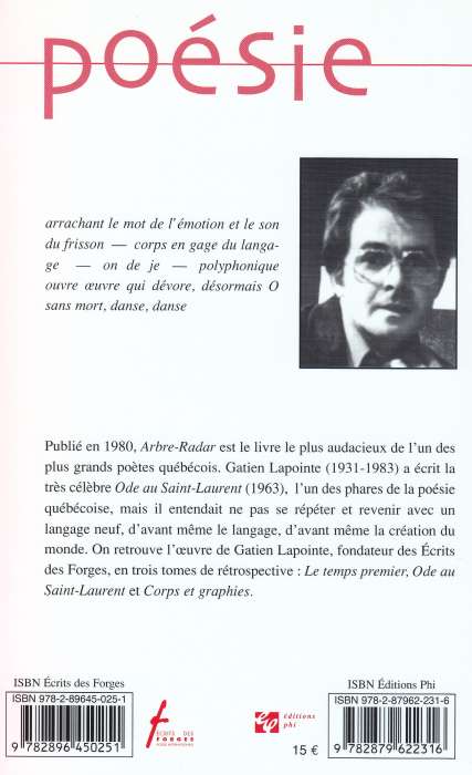 Si Gatien Lapointe (1931 – 1983) fut surtout connu comme l’un des poètes de la poésie du pays, grâce à son immense Ode au Saint-Laurent, paru en 1963 (réédité aux Écrits des Forges en 2007), le poète n’a jamais cessé d’évoluer, de se remettre en question, de réévaluer ses recherches et de se confronter aux nouvelles tendances de la poésie contemporaine. Arbre-radar en est la preuve éclatante.