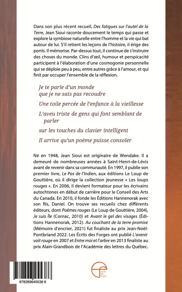 Dans son plus récent recueil de poésie, Des fatigues sur l’autel de la Terre, Jean Sioui raconte doucement le temps qui passe et explore la symbiose naturelle entre l’homme et la vie qui bat autour de lui. S’il retient les leçons de l’histoire, il érige des ponts. Il mémorise. Par-dessus tout, il continue de s’instruire des choses du monde. Clins d’œil, humour et perspicacité des points de vue participent à l’élaboration d’une cosmogonie personnelle qui se déploie peu à peu, entre autres grâce à l’amour, et qui finit par occuper l’ensemble de la réflexion. La poésie y prend tout son sens :