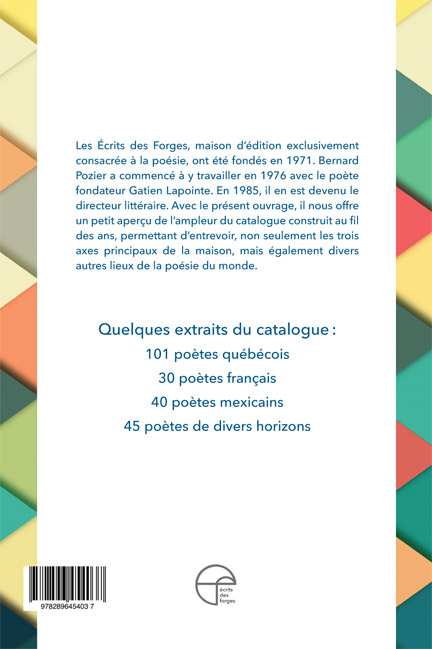 Préparée par Bernard Pozier, directeur littéraire et président du conseil d’administration des Écrits des Forges, l’anthologie Écrits des Forges : 50 ans de poésie dresse un portrait vivant du travail d’édition qui a été entrepris en 1971 par Gatien Lapointe à l’occasion d’un cours donné à l’Université du Québec à Trois-Rivières. Au fil des ans, comme l’écrit l’anthologiste dans sa préface à l’ouvrage :