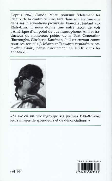 Depuis 1967, Claude Pélieu poursuit fidèlement les idéaux de la contre-culture, tant dans son écriture que dans ses interventions picturales. français résidant aux Etats-Unis, il nous donne une autre façon de voir l’Amérique d’un point de vue francophone. Ami et traducteur de nombreux poètes de la Beat Generation (Burroughs, Ginsberg, Kaufman…), il est surtout connu pour ses recueils Jukeboxes et Tatouages mentholés et cartouches d’aube, parus directement en 10 / 18 dans les année 70.