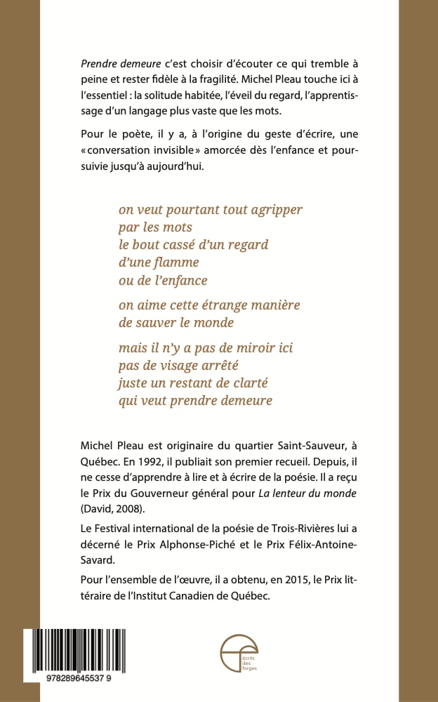 Michel Pleau nous invite, à Prendre demeure : le poète se rappelle l’enfant qu’il a été, il illustre le chemin parcouru par lui pour devenir l’adulte, le poète, l’être humain qu’il est devenu : « J’observe beaucoup. J’effeuille le monde en le lisant ».
